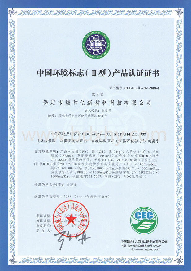 我公司于2018年5月通過中環聯合(北京)認證中心對我公司嚴格審查,認證通過并獲得《中國環境標志(II型)產品認證證書》—認證產品名稱:潤版液,油墨清洗劑。